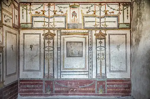 The house is painted throughout in the Pompeian Fourth Style and is valued because its decoration is all of a single style and single period, unlike many others that are often a mix of styles from different periods.[4]