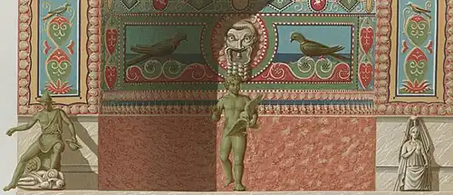 The temple-style fountain with a marble-clad basin and apsidal niche constructed of brick against the west wall is plastered and decorated with mosaic tiles and sea shells. Scenes depict cavorting dolphins and colorful parrot-like birds. Originally, water spouted from the open mouth of a comic theatre mask depicting an old bearded man in the apse but the marble sculpture is no longer present. Above the water spout depicted in mosaic is a river god. Behind the fountain, a mural of a garden with trees and fluttering birds behind a white fence is painted in a central panel within a red ground above an ochre dado demarcated by white columns with red bases. To the left of the fountain is a badly faded landscape of a columned temple with round two-level tower. To the right of the temple is another landscape with multi-storied structures. The ocher dado is punctuated with panel paintings of mythical sea creatures and dolphins.[12]