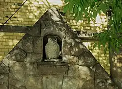 The house owes its name to the sculpture of a marble owl, a symbol of family well-being and happiness, inserted into the groove of the pointed gable above the entrance. The contrast of the glossy olive surface of the tile and the roughly machined gray stone was often found in medieval architecture.[2]