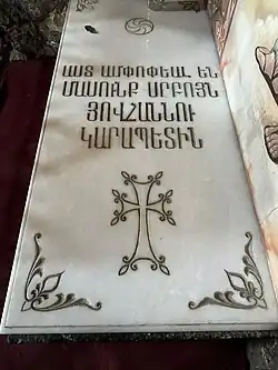 The monastery walls are covered with rich lapidary inscriptions. One large engraved text high on the northern wall of one of the monastery's auxiliary structures was added by Vache Vachutian but written in the words of his suzerains, the Zakarids.[4] It reads: