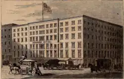 The six-story hotel (161 feet in front and 130 feet deep, with a dining room of 160 by 30 feet) opened in March 1840.[4] Hoteliers Daniel D. Howard and John P. Howard were its early proprietors.[5] They were sons of John Howard, who long operated a hotel in Burlington, Vermont.[6] By the late 1850s, J.E. Kingsley and Ainslee had taken over as proprietors.[7]