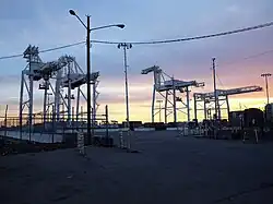 Located near Downtown Oakland, the Charles P. Howard Terminal is west of Jack London Square and is adjacent to railroad tracks and large industrial facilities. The 55-acre (22 ha) waterfront property is currently owned by the Port of Oakland. Howard Terminal has not been used by a cargo vessel since 2013. On April 26, 2018, the Port of Oakland commissioners voted 6–0 unanimously to enter in to a one-year agreement to negotiate exclusively with the Oakland A's.[41] This agreement allowed the A's to pay the Port $100,000 to study economic feasibility and environmental, transportation and accessibility issues. A similar agreement with the A's regarding the Coliseum site was also agreed upon with the city on May 16, 2017.[42]