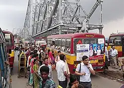 The bridge serves as the gateway to Kolkata, connecting it to the Howrah Station, which is one of the five intercity train terminus stations serving Howrah and Kolkata. As such, it carries the near entirety of the traffic to and from the station, taking its average daily traffic close to nearly 150,000 pedestrians and 100,000 vehicles.[10] In 1946, a census of the daily traffic was taken, which counted 27,400 vehicles, 121,100 pedestrians and 2,997 cattle.[13] The bulk of the vehicular traffic comes from buses and cars. Prior to 1993, the bridge also carried trams. Trams departed from the terminus at Howrah station towards Sealdah, Rajabazar, Shyambazar, High Court, Dalhousie Square, Park Circus, Ballygunge, and Tollygunge. In 1993, tram service on the bridge was discontinued due to the increasing load on the structure. However, the bridge still continues to carry much more than the expected load. A 2007 report revealed that nearly 90,000 vehicles were plying on the bridge daily (15,000 of which were goods-carrying), though its load-bearing capacity is only 60,000.[24] One of the main reasons for the overloading was that, although vehicles carrying up to 15 tonnes are allowed on the structure, vehicles with 12-18 wheels and carrying loads up to 25 tonnes often plied on it. From 31 May 2007 onwards, overloaded trucks were banned from crossing the bridge and were redirected to the Vidyasagar Setu instead.[25] The road is flanked by footpaths 15 feet (4.6 m) wide, which are thronged with pedestrians.[5]