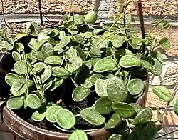 It has small round leaves that are 1.5 to 2 cm long. The leaves are dark green, hairy, and have grey spots intermittently dispersed.