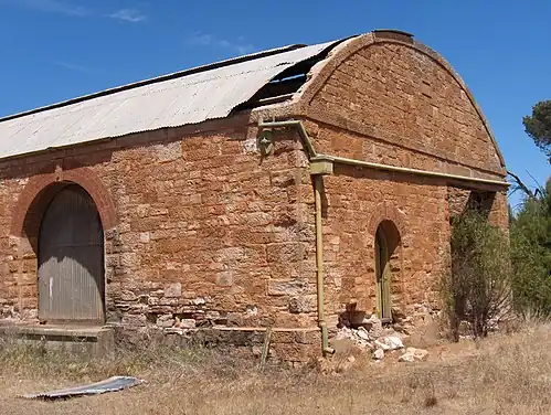 The Gladstone railway line ran from Balaklava to Blyth and further on into the Mid North of the state.[3] Due to various reasons, this particular line had become obsolete and the tracks were dismantled in the late 1980s. The original historic stone railway shed remains standing alongside the grain silos which are still in use, but now serviced by road.