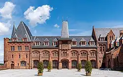 Hradec nad Moravicí is known for the Hradec nad Moravicí Castle. It is a complex formed by the older building, known as White Castle, newer building known as Red Castle, and a large castle park. The original Gothic castle was rebuilt into a Renaissance residence by the Pruskovský of Pruskov family after 1585. The castle was damaged by fire in 1796. It was reconstructed in the Empire style in 1796–1804, and the English-style park was founded. The White Castle has retained its Empire appearance to this day. In the second half of the 19th century, the complex was extended by the neo-Gothic Red Castle with stables, coach rooms and mural wall. The last structure built in the castle complex was the pseudo-Gothic White Tower.[3][4]