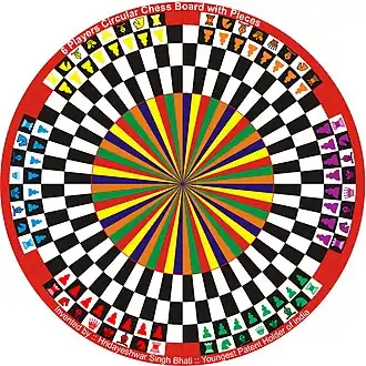 Bhati's version of multiplayer chess is played on a circular board with 228 black and white cells (or spaces). The 12 red spaces are not used. Up to six players in teams of two or three can play. Bhati's design employs all the standard chess pieces and their moves.[14][15] Individual armies are distinguished by colour.