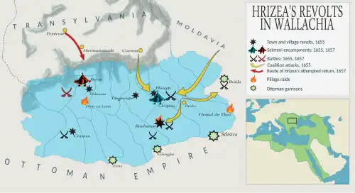 The Wallachian truce was again endangered after less than two years. In December 1656, Captain Priboi, probably as a Hrizea partisan, tried to assassinate Constantin, before being stopped by the Transylvanian bodyguards.[87] In early 1657, Rákóczi intervened in the Swedish Deluge, which caused him to be absent from the capital and sparked a succession crisis at home.[88] During this interval, as many as 500 Seimeni exiles, whom Rákóczi had left in charge of the city defenses,[89] helped their leader break out of prison. They managed to do so on March 23, 1657, while Hrizea was praying in church.[90] Hrizea, with his family and his retinue, rode to Hermannstadt. He could not enter that city, being harassed by local Transylvanian Saxons and Romanians, but eventually crossed the Olt River.[91]
