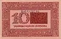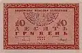 10 shahiv | 30 × 25 | Light brown | Inside flower ornaments, a big tryzub illuminated by the sun. The base of the tryzub touches the outline of Ukrainian borders as shown on the globe. Name of state above the composition, denomination below it | Inside a single- or double-striped frame, a tryzub, under which a notice reading: "Ходить нарівні з дзвінкою монетою". | Anton Sereda | 17 April 1918 | 8[33] or 18[25] July 1918 | 1920 |