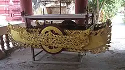 The hti is placed on the top of a pagoda and hung with a multitude of bells.[10] The hti of prominent pagodas are often made entirely of gold or silver.[10] The bells are used to attract the attention of good spirits in Tāvatiṃsa and other abodes of the devas of Mount Meru.[10]