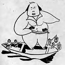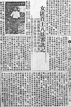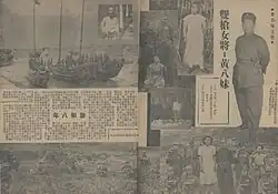Huang's loyalties in the war were considered suspect; her allegiances and alliances shifted frequently between not only China and Japan but also between local minor groups as the balance of power in the war changed.[8] One report mentions that Huang and 6,000 subordinates were fighting for the Japanese in early 1938.[9] Huang was captured by Japanese forces in Pudong in August 1938 and was the subject of a propaganda campaign to paint her as a traitor solely aligned with Japan. This had little effect and she was shortly thereafter free again and once again recruited by the Chinese military. In 1939, the Chinese government-aligned magazine Friends of the Wounded published an article praising Huang as a war heroine with impressive shooting skills and downplaying her criminal and suspect past.[3] Huang earnt the nickname "Two Guns"[4][a] during this time due to jumping onto enemy ships while carrying two guns.[4][1]