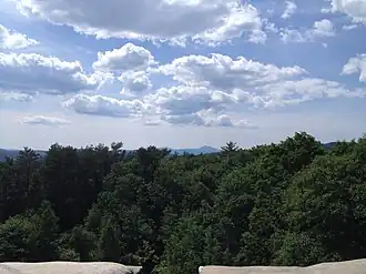 The road to the summit was initially constructed in 1910.[2] During the 1920s, extensive plantings of red pines were undertaken along the hillside behind the Vermont Statehouse and below the tower site. By the 1960s, the stands of pines grew to obstruct what had previously been a clear view of the statehouse and downtown Montpelier from the tower (and vice versa).[6] Between 1933 and 1936, as part of the New Deal, the Civilian Conservation Corps under the direction of the Vermont Forest Service materially enhanced much of the park. These enhancements were done carefully so as to not cause any disfigurements to the landscape, "yet improved enough for greater human enjoyment".[13] Designed to make Hubbard Park more usable and beautiful- the upgrades focused on improving infrastructure and planting new trees as well as clearing brush and down material to reduce fire hazards. During this time all of the interior roads were regraded, widened, drained, and graveled. Hubbard Park Drive was improved to allow the park to be readily accessible from either the east or west side of Montpelier. A new bridle trail was constructed which allows visitors to hike the entire park area. 3,000 Norway spruce and 1,000 red pine trees were planted. The park's seven fireplace picnic area and a sledding hill near the parks main entrance were also added. In all twenty acres of woodlands were cleared of brush and down material, seven acres were reforested, and four miles of road was built or improved.[13]
