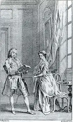 Gravelot himself was an inveterate, even obsessive reader; his brother's Éloge reports that he would take a small volume to bed with him, in case of insomnia. His easy and elegant book illustrations[13] were worked up from dressed mannikins, fully jointed down to their fingers, which he had made expressly in London.[14]