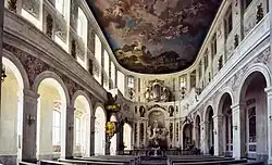After the death of Augustus the Strong in 1733, his son and successor Augustus III had Hubertusburg rebuilt in a Rococo style and again greatly expanded until it got its present appearance in 1752. The three-story structure now formed a rectangle, with the main façade including an oval two-story avant-corps and bearing the coat of arms of Augustus III as imperial vicar. The roof received a distinct canopy crowned by an onion dome and a weather vane with a jumping stag. Attached to the main palace extended functional buildings and stables were erected, grouped around a vast courtyard. The Saxon prime minister Heinrich von Brühl had his own palais in the right wing, embodying his special position at the court. From 1755 Brühl, though no great huntsman, served as commander of the Hubertusburg court hunts having his own cuisine and employees at his disposal. Hubertusburg was often the scene of extravagant parties and festivities.[1] The last Hubertus feast was celebrated in 1755, before the outbreak of the Seven Years' War.