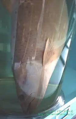 The Sichuan taimen typically has a dark black, dorsal, and adipose fin; a silvery white underside; and small, irregular dark spots across the body, head, and gill cover.[4][5] Their coloring can range from a darker orange/red, to a lighter tan/yellow depending on stage of life.[3] They typically have between 125 and 152 scales, 14 gill rakers, and can grow to 72 cm (2 ft 3in) in length.[4]