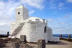 The Huer's Hut is a one-storey circular structure with walls made from stone rubble. An external staircase leads to a stone roof that is battlemented. There is a large opening on the sea-facing north wall flanked by splayed projecting walls. There is a triangular-headed window in the centre of the west face with two smaller, diamond-shaped openings on either side. The eastern face contains a pointed-arch window with a raised surround flanked by another diamond-shaped opening and a large, blocked-up, mullioned window. All the windows in the structure are unglazed and the northern opening, which acts as a doorway, is secured with metal gates. There is a fireplace in the centre of the structure with a single stack chimney.[6] The building is constructed of local killas stone and lime mortar. The whole structure is further coated in lime and sand render and painted with limewash.