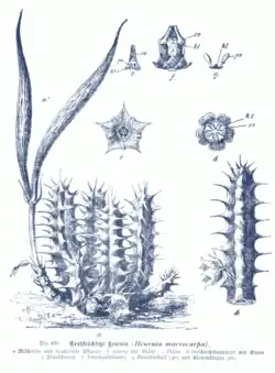 Huernia macrocarpa is a colorful succulent plant related to the milkweeds. This beautiful plant grows to a height of five or six meters, extending fleshy, toothed arms, dark pink star-shaped flowers and small eyes. It is commonly kept as a potted houseplant.[1]