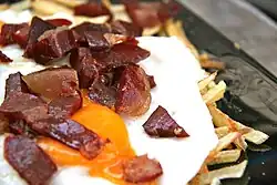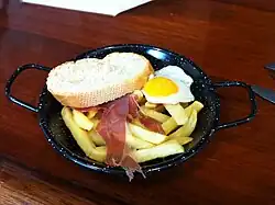 Huevos rotos or huevos estrellados is any of a number of Spanish dishes involving eggs fried in a large amount of olive oil or any other oil. In Madrid, huevos estrellados is a dish based on a pan-fried egg with a liquid yolk, accompanied by French fries (some modern versions of this dish use chips), some kind of meat (typically ham, bacon, or a sausage like chorizo or chistorra). The dish is served hot, immediately after plating.[1]