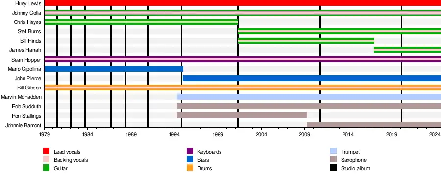 Huey Lewis and the News (formerly known as Huey Lewis & The American Express) are an American rock band based in San Francisco, California. They had a run of hit singles during the 1980s and early 1990s, eventually achieving 19 top ten singles across the Billboard Hot 100, Adult Contemporary, and Mainstream Rock charts. Their sound draws upon earlier pop, rhythm & blues and doo-wop[1] artists, and their own material has been labeled as blue-eyed soul, new wave, power pop, and roots rock.[3][2]