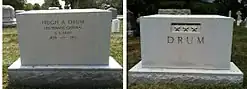 Drum died in New York City on October 3, 1951.[53] His funeral mass was celebrated at St. Patrick's Cathedral by Cardinal Francis Spellman.[54] Drum was buried at Arlington National Cemetery, Section 3, Site 1447-R.[55]