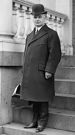 In July 1917, President Woodrow Wilson appointed Frayne to the War Industries Board as a representative of labor. He organized the prison labor and national waste reclamation section of the board's labor division. He became chairman of the labor division and served until the board dissolved on January 1, 1919.[2] He also served on the War Labor Policies Board organized by Felix Frankfurter to maintain industrial peace during the war.[2] For his efforts in the board during World War I, he received the Distinguished Service Medal on May 17, 1922.[2] He was active in prison reform work in New York City and received a gold medal from the National Committee on Prisons and Prison Labor in 1920.[2] On November 11, 1920, he was appointed as a member of the military hospital commission.[2] After William Green became president of the AFL, he worked as one of his aides.[2] In December 1932, he was one of three receivers who took control of the New York local of the Motion Picture Operators Union.[3]