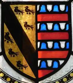 Arms of Sir Hugh Luttrell (c.1364-1428) (Or, a bend between six martlets sable) impaling arms of Beaumont of Shirwell, Devon, (Barry of six vair and gules, here shown incorrectly as barry of eight), the family of his wife Catherine Beaumont (d. 1435). Detail from 19th century Luttrell heraldic stained-glass windows, south wall of Dunster Church