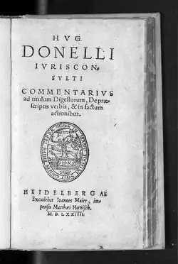 Doneau, who was born into a well-respected family, studied law in Toulouse and Bourges. Bourges was then a center of legal humanism and François Douaren (Franciscus Duarenus), one of the most famous members of this movement was among Doneau's teachers at Bourges. In 1551, Doneau received a doctorate from the University of Bourges and began teaching there. However, because of his Calvinist confession, Doneau had to flee to Geneva after the St. Bartholomew's Day massacre in 1572. Doneau accepted a call from the Reformed Elector Palatine Frederick III to a professorship at Heidelberg and assumed the post in early 1573. Doneau, however, would have to relocate again in 1579 because Heidelberg and the surrounding Electoral Palatinate were converted to the Lutheran confession by Frederick's successor Louis VI (r. 1576–83), and the elector required subscription to the Formula of Concord.[1] Doneau then moved to the newly founded Leiden, but in 1587, the political circumstances forced him into exile for the third time: Doneau had to leave Leiden in 1588, because of his sympathies for Robert Dudley, 1st Earl of Leicester. Doneau returned to Germany and became professor of law at the Altdorf Academy (the university of the Free Imperial City of Nuremberg). He died in Altdorf in 1591.