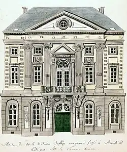 The Soiron House has the appearance of a townhouse (French: hôtel particulier) due to its broad, stately façade on the Grote Gracht. The building is five bays wide and three stories high. The façade has a central avant-corps with fluted ionic pilasters and a crowning pediment. The first floor of the façade is of brick with blockwork, with round-arched windows and in the middle a round-arched carriage gate. Above the gate, on sculpted brackets, there is a balcony with a wrought iron fence with geometric ornaments. Above the balcony doors is a smaller pediment. On either side of the balcony are rectangular windows, four high on the second floor and four low on the second. There are festoons between the windows of the avant-corps.[4]