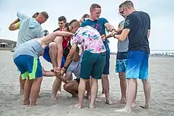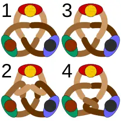 The knot is a disentanglement puzzle in which a group of people in a circle each hold hands with two people who are not next to them, and the goal is to disentangle the limbs to get the group into a circle, without letting go of grasped hands. Instead, group members should step over or under arms to try to untangle the knot. Not all human knots are solvable, as can be shown in knot theory (see unknotting problem), and can remain knots or may end up as two or more circles.[1]
