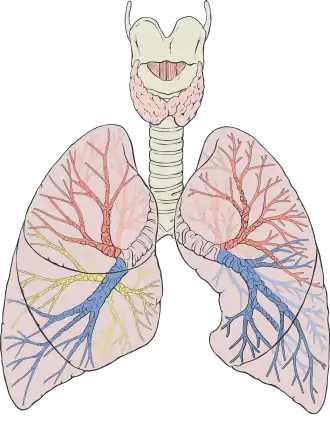The lower respiratory tract is part of the respiratory system, and consists of the trachea and the structures below this including the lungs.[32] The trachea receives air from the pharynx and travels down to a place where it splits (the carina) into a right and left primary bronchus. These supply air to the right and left lungs, splitting progressively into the secondary and tertiary bronchi for the lobes of the lungs, and into smaller and smaller bronchioles until they become the respiratory bronchioles. These in turn supply air through alveolar ducts into the alveoli, where the exchange of gases take place.[32] Oxygen breathed in, diffuses through the walls of the alveoli into the enveloping capillaries and into the circulation,[20] and carbon dioxide diffuses from the blood into the lungs to be breathed out.