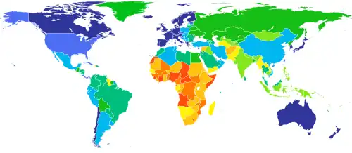2015 map showing average life expectancy by country in years. In 2015, the World Health Organization estimated the average global life expectancy as 71.4 years.[74]