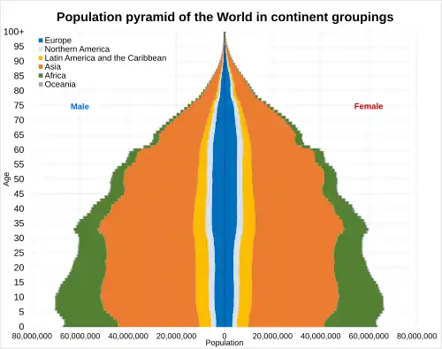 As of 2020, the global sex ratio is approximately 1.01 males to 1 female.[75] Approximately 24.7% of the global population is aged under 15, while 65.2% is aged 15–64 and 10.1% is aged 65 or over.[75] The median age of the world's population is estimated to be 31 years in 2020,[9] and is expected to rise to 37.9 years by 2050.[76]