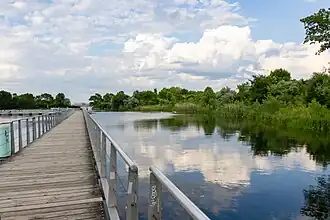 Humber Bay Park is a waterfront park located in Etobicoke, part of Toronto, Ontario, Canada. The park consists of two landspits situated at the mouth of Mimico Creek. The park is south of Lake Shore Boulevard West, near Park Lawn Road. Humber Bay Park East is 19 hectares (47 acres), while Humber Bay Park West is 120 hectares (300 acres).[1]