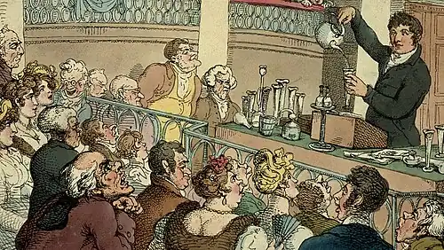 Davy's lectures included spectacular and sometimes dangerous chemical demonstrations along with scientific information, and were presented with considerable showmanship by the young and handsome man.[26] Davy also included both poetic and religious commentary in his lectures, emphasizing that God's design was revealed by chemical investigations. Religious commentary was in part an attempt to appeal to women in his audiences. Davy, like many of his enlightenment contemporaries, supported female education and women's involvement in scientific pursuits, even proposing that women be admitted to evening events at the Royal Society. Davy acquired a large female following around London. In a satirical cartoon by Gillray, nearly half of the attendees pictured are female. His support of women caused Davy to be subjected to considerable gossip and innuendo, and to be criticised as unmanly.[27]
