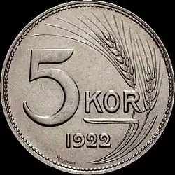 The Hungarian korona (Hungarian: magyar korona; korona in English is "crown") was the replacement currency of the Austro-Hungarian Krone/korona amongst the boundaries of the newly created post-World War I Hungary. It suffered a serious inflation and was replaced by the pengő on 1 January 1927.