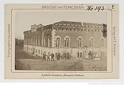 In 1849, the Hungarian revolutionaries, besieging Timișoara, destroyed the castle from its foundations, to the point where a reconstruction of the edifice was needed. The reconstruction and renovation work was finished in 1856.[10] However, the main facade of the castle was modified, this time being made in a romantic style.[11] Between 1919 and 1947, the Banat Barracks (Romanian: Cazarma Bănățeană), as it was known then, was the headquarters of the 7th Pioneers' Regiment and the 6th Heavy Artillery Regiment.[12]
