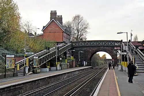 The station is in a cutting and is fully accessible by the addition of lifts to the platforms, opened in 2022.[4] A building on the Southport/Manchester-bound (island) platform (platforms 2&3) contains an accessible toilet and a waiting room. The former main station building has been converted into a bar/restaurant and has been replaced by a modern ticket office (which is staffed throughout the day until end of service, seven days a week). A small car park is available, and bus stops are nearby. Train running information is offered via digital display screens and automated announcements.