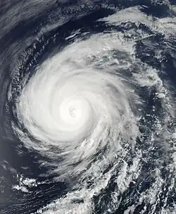 Although there were no factors inhibiting the development of Celia, the storm unexpectedly weakened again later on June 23. The storm's eye rapidly dissipated and the central dense overcast became asymmetric. Forecaster Todd Kimberlain at the NHC referred to the unexplained shifts in strength as "puzzling."[17] However, as suddenly as the weakening took place, strengthening ensued. Very strong convection formed over the center of the storm, with some cloud tops being as cold as −86 °C (−123 °F), but no eye had reformed by the morning of June 24.[18] Throughout the day, Celia became increasingly organized, with the eye fully reforming and the structure becoming more symmetrical.[19] Rapid intensification soon followed as the storm reached Category 4 status,[20] becoming one of only a handful of tropical cyclones to do so during the month of June in the eastern Pacific.[21] That evening, the storm further intensified into a Category 5 hurricane, the second storm to reach this strength during June in the Eastern Pacific basin on record.[22] Hurricane Celia attained its peak intensity around 00:00 UTC, with sustained winds of 160 mph (255 km/h) and a barometric pressure estimated at 921 mbar (hPa; 27.20 inHg).[1] The storm also displayed a well-defined eye estimated to be 17 to 23 mi (27 to 37 km) in diameter.[23]