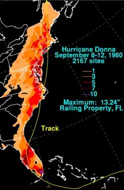 - ^ a b David M. Roth (March 6, 2013). Hurricane Donna - September 3-12, 1960 (Report). Weather Prediction Center. Archived from the original on September 21, 2013. Retrieved September 6, 2013.