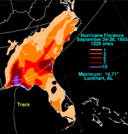 Due to the strongest winds affecting a sparsely populated area near the coast, overall damage in the United States was minor, estimated around $200,000 (1953 USD, $2.35 million 2025 USD).[1] Heavy rainfall was reported in portions Alabama, including a total of 8.72 in (221 mm), one inch shy of the 24‑hour precipitation record in Montgomery set in 1892. There, the rainfall backed up sewer drains, flooding homes and cars. The storm left about 4,000 people without electricity in the area.[11] While Florence moved across the southeastern United States, the heaviest rainfall fell to the near and left of its center, due to interaction with a cold front.[4]