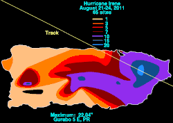 Across Puerto Rico, heavy rains caused extensive damage to roads while hurricane-force winds toppled many trees and utility poles, which led more than 1 million residences without power.[128][129] President Barack Obama declared a state of emergency.[130] About 121,000 customers were cut off from potable water service at the height of the storm.[131] Across the territory at least 1,044 people had to take shelter, and 1,446 people in total were evacuated.[132] At higher elevations, winds estimated by radar neared 111 mph (179 km/h).[133] The highest amounts of precipitation fell across eastern parts of the territory; in Gurabo, a peak total of 22.04 in (560 mm) was recorded.[134] Several rivers burst their banks as a consequence of the rains, causing additional flooding.[129] The agricultural sector also suffered losses from the storm, particularly near the location of landfall. High winds uprooted crop plants, and several coffee and banana plantations sustained minor damage.[135] Of the plantations, the most affected were situated in Yabucoa and Maunabo, where severe flooding washed out copious amounts of banana crop.[136] The rains continued to fall for hours into the wake of the storm, prompting the issuance of flood watches.[137] In total, Irene affected over 1,500 people in Puerto Rico, and one driver was killed after their vehicle was caught in swollen currents.[132] Preliminary estimates indicate structural damage could be as high as $500 million (USD), with additional losses due to the three-day labor suspensions pinned at over $60.4 million (USD).[138]