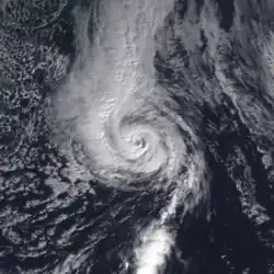 Later on October 29, while slowly tracking north, Tanya leveled off as a low-end Category 1 hurricane. By the next morning, a cold front to the west forced Tanya to accelerate in a more easterly track .[6] It remained fairly well organized with a distinct eye as it became wedged in a narrow zone of warm air between the cold front to the west and the upper-level low to the northeast.[1] Despite slightly cooler water, Tanya strengthened a bit more that afternoon, reaching its peak intensity of 85 mph (135 km/h) with a barometric pressure of 972 mbar (28.7 inHg) as the forward speed increased.[7] That intensity was maintained until late on October 31, when Tanya began to weaken as it traveled over cooler waters and the eye became obscured.[8] Early on November 1, Tanya began to lose tropical characteristics while still a hurricane. Hurricane Tanya was also heading rapidly northeast towards the Azores at the time.[9] Tanya was downgraded from a hurricane to a tropical storm on November 1. Despite weakening, the wind field of Tanya became larger.[10] That evening, Tanya was declared fully extratropical as it passed the Azores.[11] The remnant cyclone turned north, before being absorbed by another extratropical cyclone early on November 3.[1]