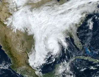 Dry air wrapped around the northern half of Zeta's circulation as it moved off shore over the southern Gulf of Mexico, leaving its center partially exposed,[8] though it began to re-intensify on October 28, in a conducive environment of low shear and warm sea surface temperatures.[1] At 06:00 UTC on October 28, while located about 410 mi (660 km) south of New Orleans, Louisiana, Zeta became a hurricane again.[9] It then began to accelerate, turning towards the northeast because of an approaching upper-level low and associated cold front moving across the Southern Plains while ridging was located off the Southeast Atlantic U.S. Coast.[10] While within the swift flow between these systems, Zeta rapidly intensified as it moved quickly, with a forward speed of (25–30 mph (40–48 km/h), toward the Louisiana coast.[1] Despite marginal sea-surface temperatures and increasing wind shear, the storm's velocity kept it from weakening.[10] It continued to strengthen until it reached its peak intensity, as a category 3 hurricane, with sustained winds of 115 mph (185 km/h) and a minimum barometric pressure of 970 mbar (29 inHg), as it made landfall near Cocodrie, Louisiana, at 21:00 UTC.[1] Operationally, the National Hurricane Center analyzed the storm to be at high-end category 2 strength at landfall, but it was upgraded to a category 3 in post season analysis.[11] The storm began to gradually weaken as it moved directly over New Orleans and then into southern Mississippi.[1] Its maximum sustained winds decreased to tropical storm strength early on October 29, about 25 mi (40 km) south-southeast of Tuscaloosa, Alabama.[12] It then accelerated northeastward across northern Georgia and the southern Appalachian Mountains,[1] before transitioning into a post-tropical cyclone about 25 mi (40 km) south-southeast of Charlottesville, Virginia.[13] The system continued moving rapidly northeastward overnight on October 29–30, becoming entwined with a frontal zone[1] and bringing accumulating snow to parts of New England,[14] before dissipating east of the mid-Atlantic U.S. coast on October 30.[1] Several days later, the low-pressure system carrying Zeta's remnant energy brought heavy rain and strong winds to parts of the United Kingdom.[15]