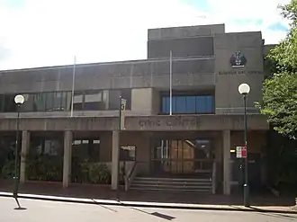 In January 1977, Hurstville Council acquired the former 'Rivoli Hall' on the other corner of Dora Street and McMahon Street, which was soon demolished to make way for a Brutalist style extension to the Civic Centre that would incorporate a new central library designed by the Council Architect.[28] The extension and library, completed at a cost of approximately $4.3 million, was officially opened on 30 July 1982 by the Premier of New South Wales, Neville Wran.[29]