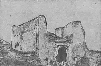 The castle was built as a borderland fortalition on the initiative of Marcin Kalinowski,[2] Crown Field Hetman. When the hetman was taken prisoner by the Tatars in 1648, the fortress was captured and destroyed by Cossacks. Quickly rebuilt, it still managed to defend itself against the Cossacks and Tatars in 1653 and against the Muscovite army in 1655. Despite the victory, the fortress was severely damaged.[4] The castle was besieged and captured during the Polish-Turkish War in the 1670s-80s. In 1683, after the defeat of the Turks at Vienna, it was recaptured by Polish troops under the command of Andrzej Potocki, castellan of Kraków. However, the Turks, while retreating, destroyed the defensive walls of the city and partially also the castle.[4] It survived in good condition until the end of the First Republic.[1] The castle, which existed in a semi-ruined state, was sold by Agenor Romuald Goluchowski in the first half of the 19th century to a local rabbi, who dismantled the structure and built a new palace and synagogue for himself, which were completely destroyed in 1914–1918,[5] during World War I.[4] Before 1939, there was an entrance gate in the ruins of the ruins of the castle in Husiatyn.[6]