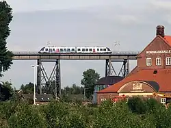 Since January 2015, in addition to the hourly Regional-Express service, a Regionalbahn service runs hourly between Kiel and Rendsburg, which also stops in Kiel-Hassee CITTI-PARK, Kiel-Russee, Melsdorf, Achterwehr, Bredenbek and Schülldorf.[4] These stations were reactivated with the exception of the new Kiel-Hassee CITTI-PARK station and the Bredenbek station which was relocated from Kronsburg. The dismantled second track from Kronsburg was rebuilt at the new station to increase the line's capacity.[5][6] Only individual Regionalbahn services operate to Schleswig or Husum. The least frequented stations of Kiel-Russee and Achterwehr are request stops.