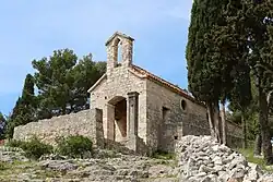 On the cape to the south of the town lies the Franciscan Monastery with a church of Our Lady of Mercy, built in the late 15th century.[5] Hanibal Lucić's grave is under the main altar in the church. The cloister, with its monumental rounded arches with a well in the middle, dominates the whole of the Renaissance monastery. The bell tower, in Renaissance style, is the work of an artist from Korčula.