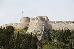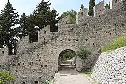 The town walls date from the 13th century and, with later additions and renovations, stretch from the fortress down to the square where they join the third wall in an east–west direction. This wall is practically camouflaged by a series of patrician houses built into it. The walls are interspersed with four-cornered side towers, the construction of which lasted, with essential repairs, from the 13th to the 16th century. The current fortress Fortica, also known as Tvrđava Španjola (Spanish Fort) was constructed following the gunpowder explosion in 1579 which devastated the old fortress.[4] Today, the fortress includes a modern tourist complex, and provides a superb view of the town and its surroundings. In 1811, during the rule of the Napoleonic Empire, a second fortress Trđava Napoleon was constructed on the higher hill to the northeast. The site now also houses an observatory.