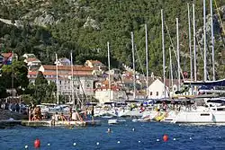 The port of Hvar, set in a picturesque natural bay, with the Pakleni Otoci island chain protecting it to the south, is a safe haven for boats year round. The town is a common port of call for yachts sailing around the Adriatic, especially in the summer months. There are regular catamaran ferry services from the port between Hvar and Split, Brač, Korčula, Lastovo, and Vis.[8]
