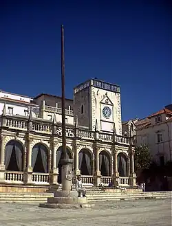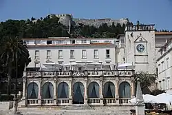The town Loza (Loggia) lies at the western end of the Pjaca, looking out on to the bay. Together with Leroj (Clock Tower), the Loggia is the only remains of the former Governor's Palace.[4] The Communal Loggia (loggia communis) was first mentioned as early as in the 13th century and referred to again in the Statute of Hvar in 1331.[4] The only remains of the Governor's Palace are two reliefs of the Venetian lion, a large well and a lintel from the Palace chapel dating from 1612. The new Loggia, a late Renaissance building, was the work of the master Tripun Bokanić in the 16th century. Today, the interior of the loggia is decorated in a neo-Renaissance style and serves as a reception hall and exhibition room for the Hotel Palace, and also for the town of Hvar.